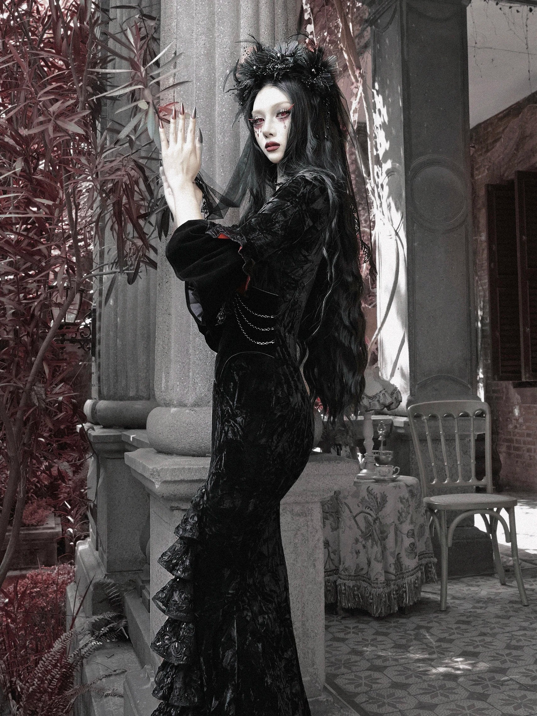 Blood Supply Original Design Bloody Red Black Gothic Velvet Tube Strapless Dress Trumpet Long Slim Party Vestido Halloween