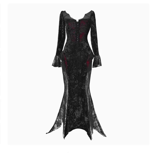 Blood Supply Original Design Vampire Black Red Dress Lace Patch Gothic Velvet Trumpet Long Sleeve X-Long Dress Halloween