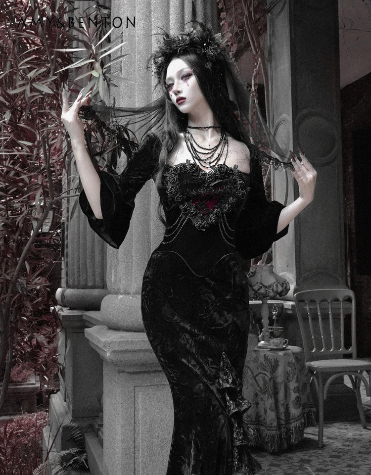 Blood Supply Original Retro Palace Style Goth Velvet Tube Top Dress Mermaid Dress Halloween Winter Subculture Sexy Hot Girl Sets