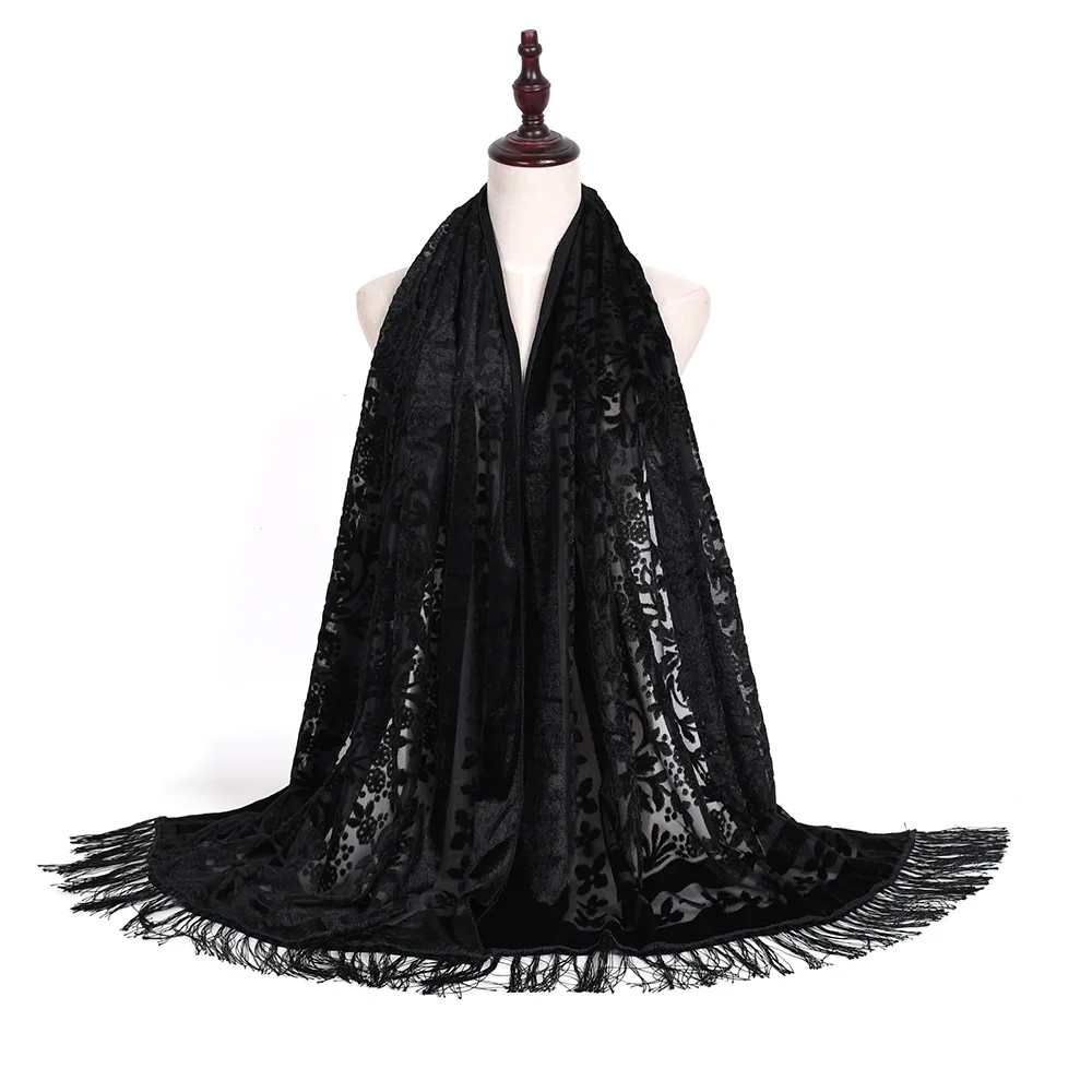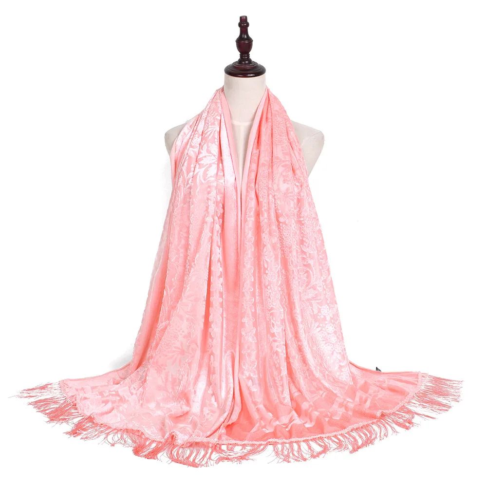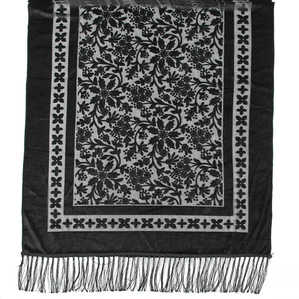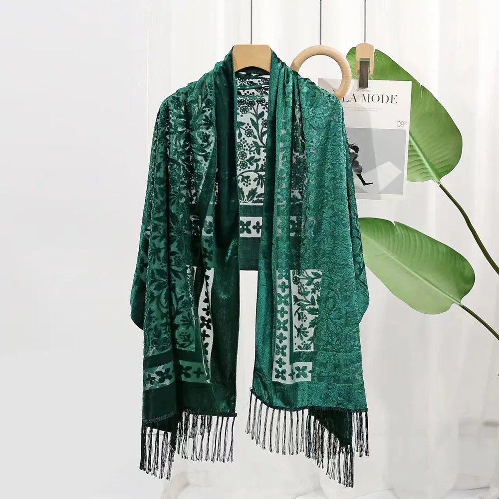 New Bohemian Ethnic Style Green Velvet Long Shawl Plain Color Floral Pattern Multi-Functional Scarf for Women's Summer Parties